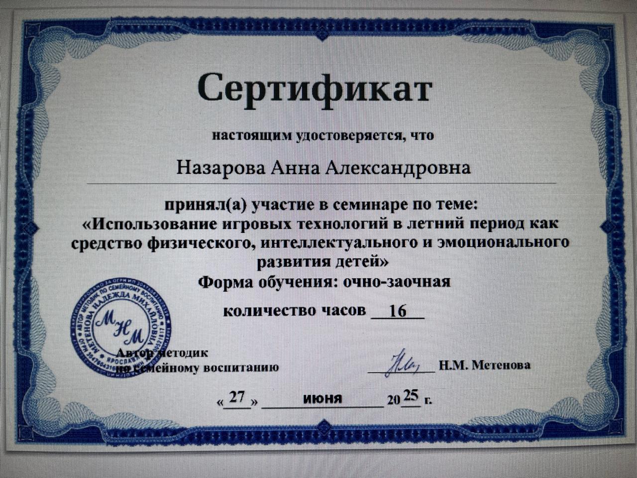 Сертификат "Использование игровых технологий в летний период как средство физического, интеллектуального и эмоционального развития детей" 27.06.2025г.