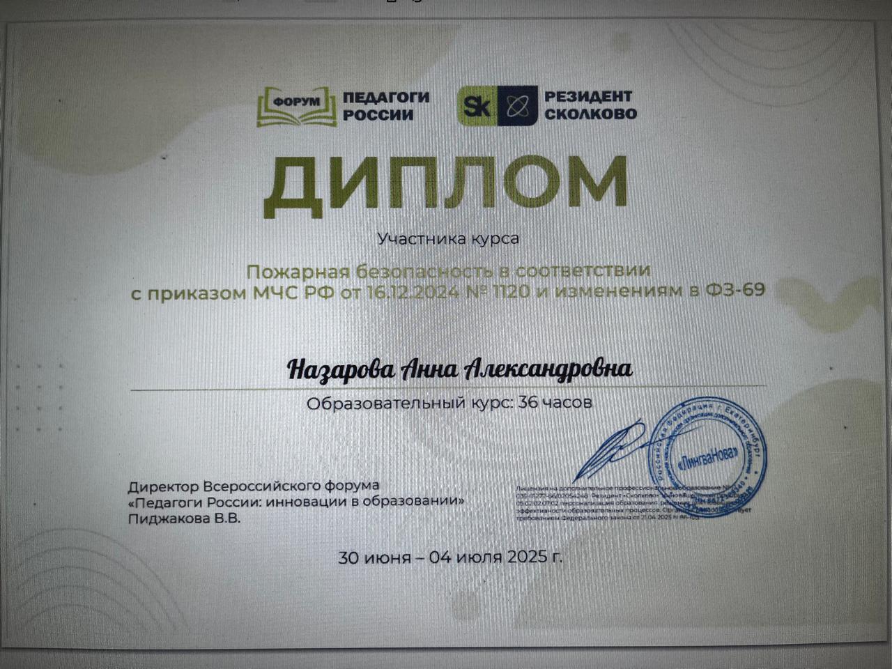 Диплом "Пожарная безопасность в соответствии с приказом МЧС РФ" 36 часов, 30.06. - 04.07.2025 г.